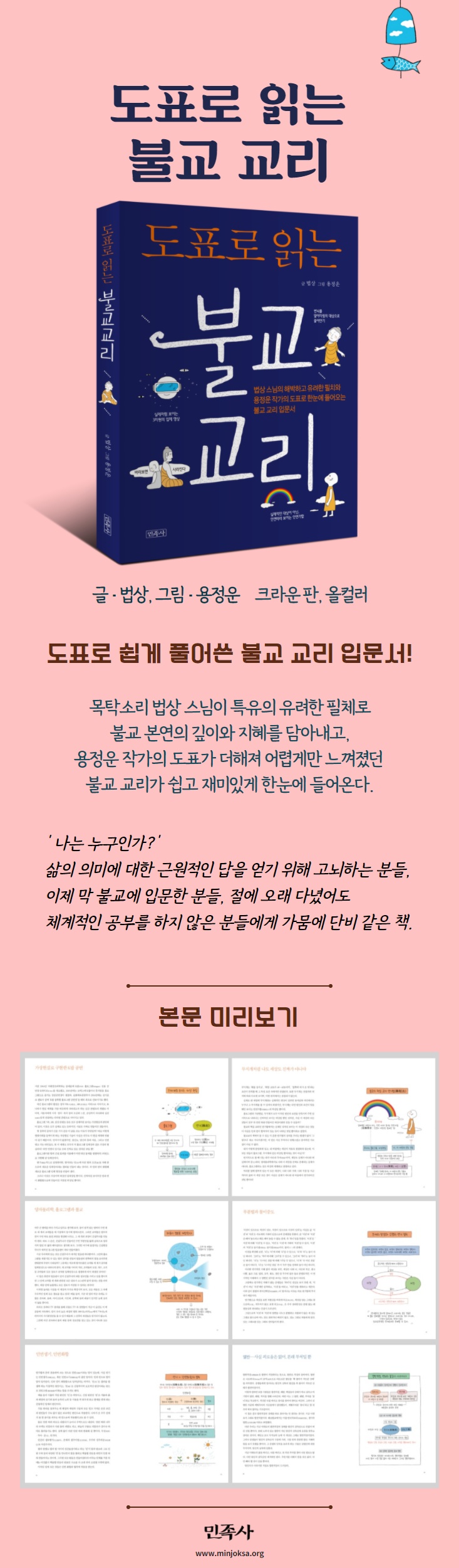 '불교' 하면 딱딱하고 지루하다는 이미지를 탈피하기 위해 민족사가 기획한 '도표로 읽는' 시리즈 세 번째 책, '도표로 읽는 불교 교리'는 유튜브채널 '법상스님의 목탁소리'를 통해 종교를 초월해 7만여 구독자와 소통하고 있는 법상 스님이 글을 쓰고, 명상카툰과 그림으로 불교를 전해 온 용정운 작가가 도표를 그렸다.
