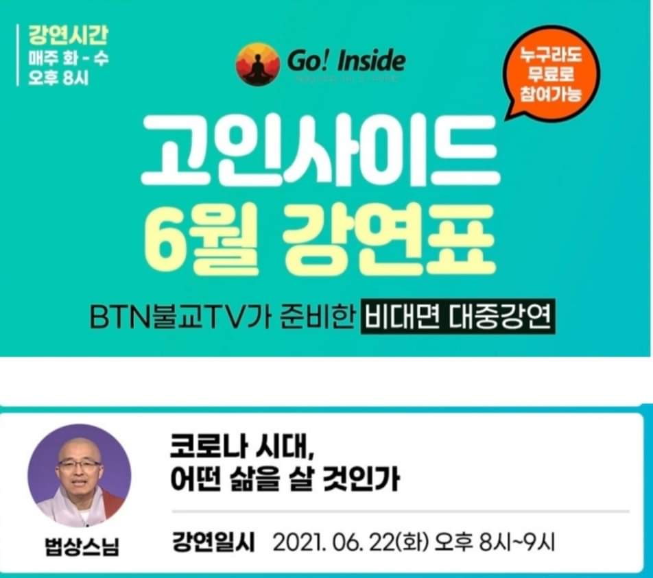 * 줌법회에 이어서, 오늘 22일(화) 저녁 8:00~9:00 BTN 불교TV 유튜브 채널에서 고인사이드 실시간 초청강연이 있습니다.