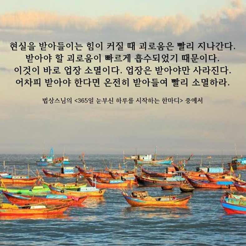 미래에 이러저러한 일이 일어나면 어쩌지? 실패하면 어쩌지? 가난해지면 어쩌지? 몸이 아파지면 어쩌지? 죽고 나서 어디로 가게 될까? 지옥에 가면 어쩌지? 하는 두려움들은 우리가 늘 가지고 다니는 짐과도 같다. 그러나 가만 생각해 보면, 이런 종류의 모든 미래를 향한 두려움은 한낱 '생각', '망상'일 뿐임이 확연해진다. 그것들은 내가 만들어낸 생각이 아닌가? 그 생각이 없다면, 당신은 지금보다 훨씬 자유롭고, 평화로운 지금을 누리며 살 수 있을 것이다. 지금 내 눈앞에 드러난 현재! 이것만이 진실할 뿐이다. 이것만이 계속되게 될 것이다. 여기에는 별 문제가 없다. 은행에 있는 돈 수십 억 중에 몇 억을 날려버렸다고 해 보자. 그 때 우리는 매우 큰 상실감과 우울과 괴로움에 빠져 있게 될 것이다. 몇 날 ..