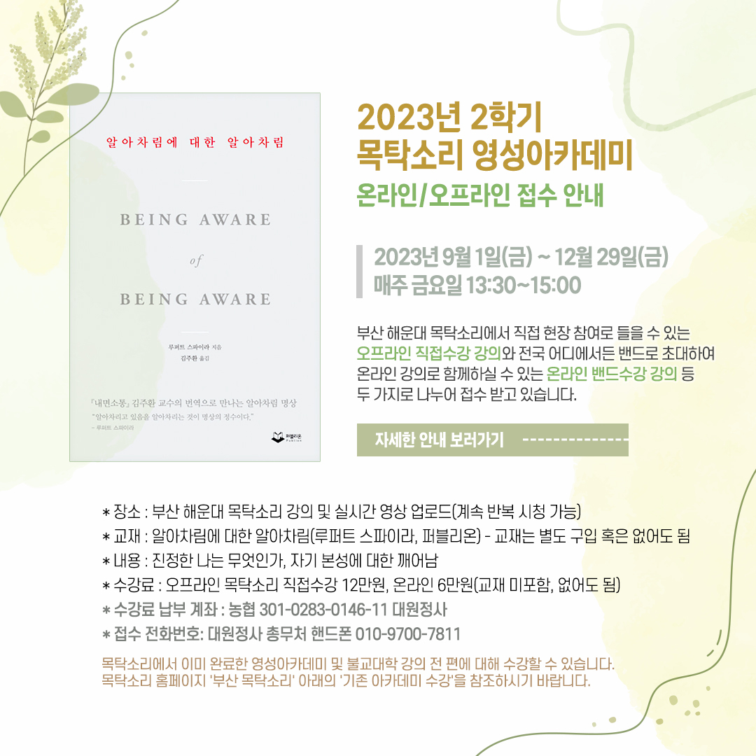 2024년 1학기 3월 개강하는 온오프라인 접수 신청을 받습니다. 에크하르트 톨레, 아디야샨티, 루퍼트 스파이라에 이어 본래면목을 확인하는 길을 현대적인 언어로 너무 쉽게 전달하는 또 다른 영성가 제프 포스터의 '경이로운 부재'를 교재로 3월~6월까지 16회 강의합니다. ○ 기간 : 2024년 3월 8일(금) 개강 ~ 6월 21일(금) 매주 금요일 13:30~15:00 /실시간 강의 및 영상 업로드 ○ 장소 : 부산 해운대 목탁소리 강의 및 실시간 영상 업로드(밴드로 계속 반복 시청 가능) ○ 강사 : 법상스님 (목탁소리, 대원정사 주지) ○ 교재 : 경이로운 부재(제프 포스터, 침묵의 향기) - 교재는 별도 구입 혹은 없어도 됨 ○ 내용 : 진정한 나는 무엇인가, 자기 본성에 대한 깨어남, 삶의 한 가..